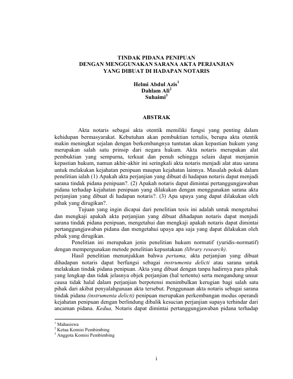 Helmi Abdul Azis, TINDAK PIDANA PENIPUAN DENGAN MENGGUNAKAN SARANA AKTA PERJANJIAN YANG DIBUAT DI HADAPAN NOTARIS. Banda Aceh Program Studi Magister Ilmu Hukum Universitas Syiah Kuala,2017