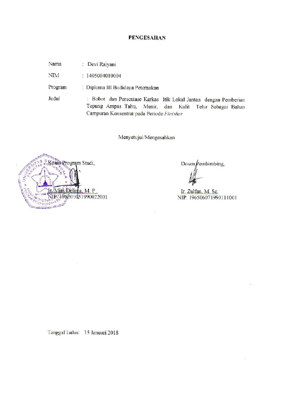 DEVI RAIYANI, BOBOT DAN PERSENTASE KARKAS ITIK LOKAL JANTAN DENGAN PEMBERIAN TEPUNG AMPAS TAHU, MENIR, DAN KULIT TELUR SEBAGAI BAHAN CAMPURAN KONSENTRAT PADA PERIODE FINISHER. Banda Aceh Universitas Syiah Kuala,2018