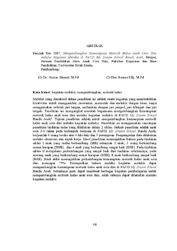 Fauziah Nur, MENGEMBANGKAN KEMAMPUAN MOTORIK HALUS ANAK USIA DINI MELALUI KEGIATAN MELUKIS DI PAUD MY DREAM SCHOOL BANDA ACEH. Banda Aceh Universitas Syiah Kuala,2018