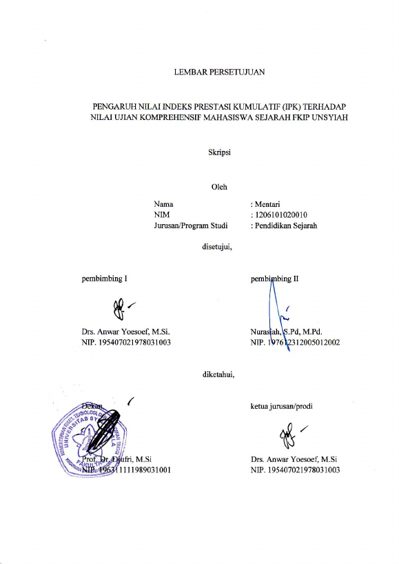 Mentari, PENGARUH N1LAIINDEKS PRESTASIKUMULATIF (IPK) TERHADAP NILAIUJIAN KOMPREHENSIF MAHASISWA SEJARAH FKIP UNSY1AH. Banda Aceh Universitas Syiah Kuala,2018