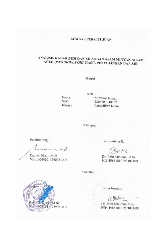 Miftahul Jannah, ANALISIS KADAR BESI DAN BILANGAN ASAM MINYAK NILAM ACEH (PATCHOULI OIL) HASIL PENYULINGAN UAP AIR. Banda Aceh Universitas Syiah Kuala,2018