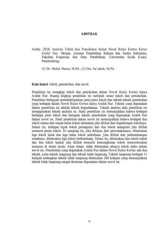 ANDRY, ANALISIS TOKOH DAN PENOKOHAN DALAM NOVEL BULAN KERTAS KARYA ARAFAT NUR. Banda Aceh Universitas Syiah Kuala,2018