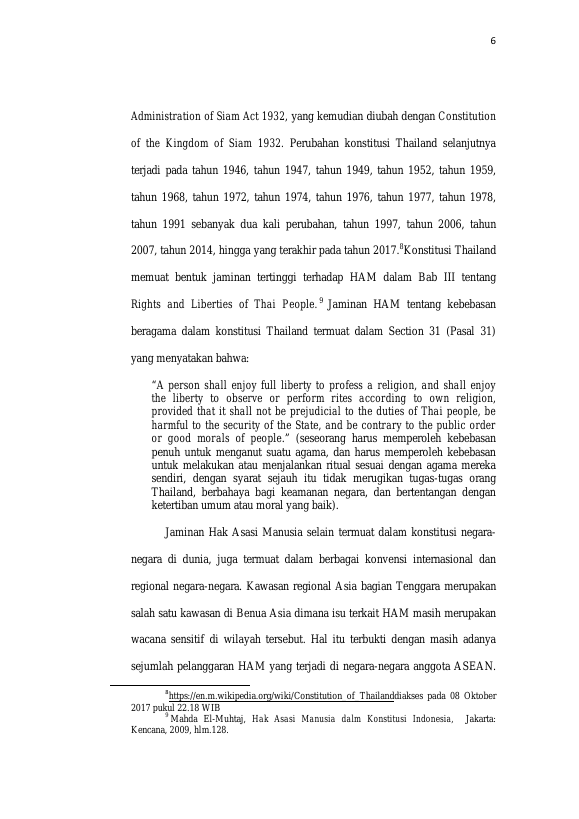 CUT AJA MAWADDAH R, STUDI PERBANDINGAN JAMINAN PERLINDUNGAN TERHADAP HAK ASASI MANUSIA TENTANG KEBEBASAN BERAGAMA DI NEGARA REPUBLIK INDONESIA DAN NEGARA KERAJAAN THAILAND. Banda Aceh Universitas Syiah Kuala,2018