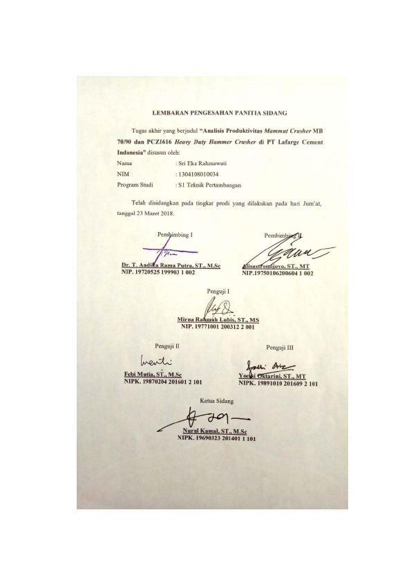 Sri Eka Rahmawati, ANALISIS PRODUKTIVITAS MAMMUT CRUSHER MB 70/90 DAN PCZ1616 HEAVY DUTY HAMMER CRUSHER DI PT LAFARGE CEMENT INDONESIA. Banda Aceh Universitas Syiah Kuala,2018