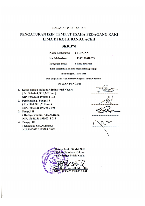 FURQAN, PENGATURAN IZIN TEMPAT USAHA PEDAGANG KAKI LIMA DI KOTA BANDA ACEH. Banda Aceh Universitas Syiah Kuala,2018