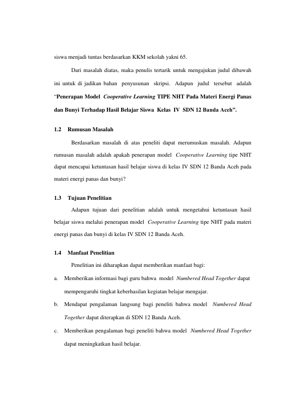PENERAPAN MODEL COOPERATIVE LEARNING TIPE NHT PADA MATERI ENERGI PANAS DAN BUNYI TERHADAP HASIL BELAJAR PENERAPAN MODEL COOPERATIVE LEARNING TIPE NHT PADA MATERI ENERGI PANAS DAN BUNYI TERHADAP HASIL BELAJAR SISWA KELAS IV SDN 12 BANDA ACEH PENERAPAN MODEL COOPERATIVE LEARNING TIPE NHT PADA MATERI ENERGI PANAS DAN BUNYI TERHADAP HASIL BELAJAR SISWA KELAS IV SDN 12 BANDA ACEH SISWA KELAS IV SDN 12 BANDA ACEH. Banda Aceh Fakultas Keguruan dan Ilmu Pendidikan,2014