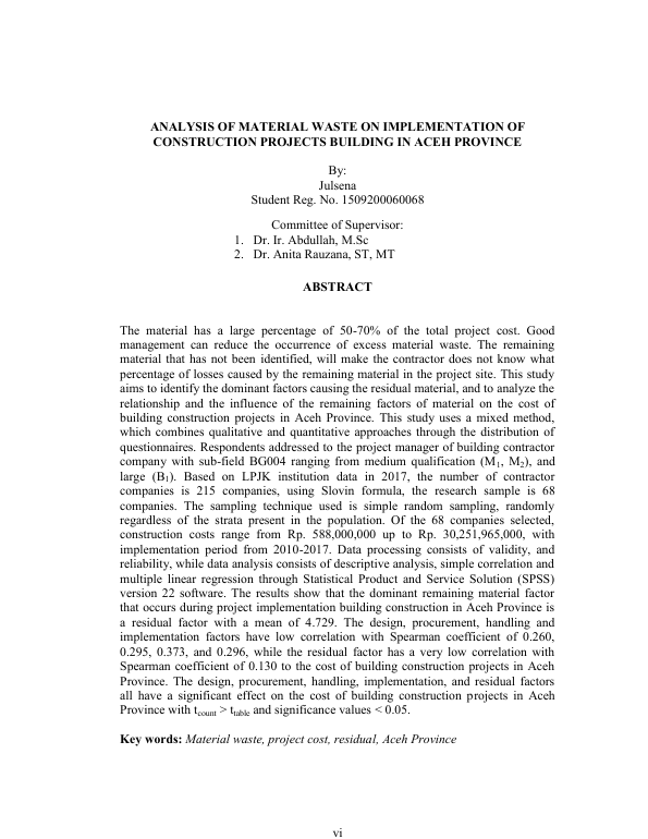 JULSENA, ANALISIS SISA MATERIAL PADA PELAKSANAAN PROYEK KONSTRUKSI GEDUNG DI PROVINSI ACEH. Banda Aceh Program Studi Magister Teknik Sipil Universitas Syiah Kuala,2018