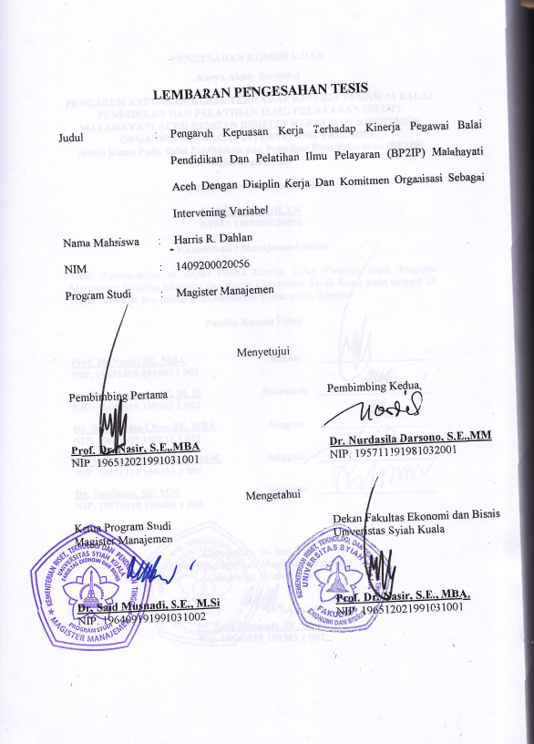 Harris R. Dahlan, PENGARUH KEPUASAN KERJA TERHADAP KINERJA PEGAWAI BALAI PENDIDIKAN DAN PELATIHAN ILMU PELAYARAN (BP2IP) MALAHAYATI ACEH DENGAN DISIPLIN KERJA DAN KOMITMEN ORGANISASI SEBAGAI INTERVENING VARIABEL. Banda Aceh Program Studi Magister Manajemen Universitas Syiah Kuala,2018