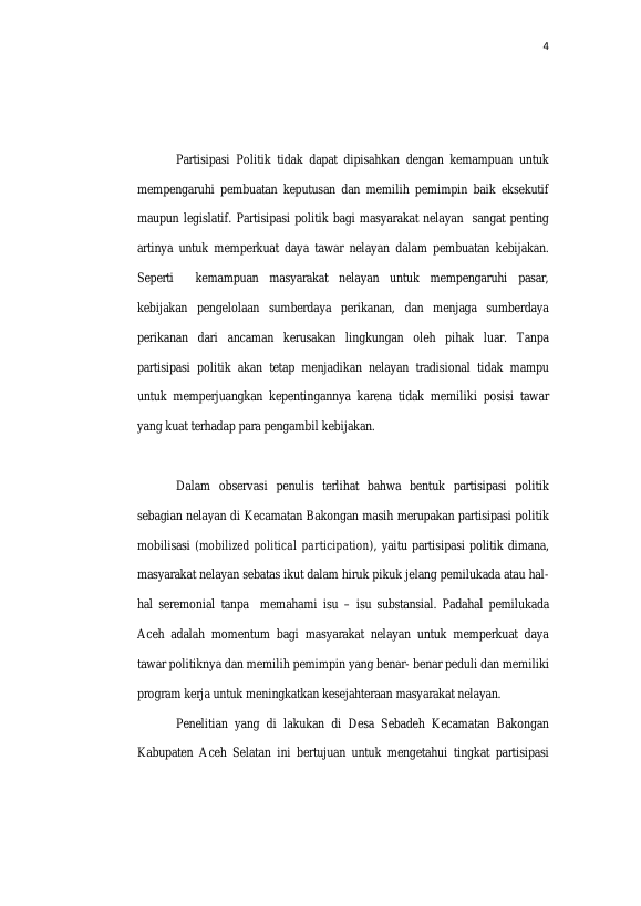Mhd. Amin, PARTISIPASI POLITIK NELAYAN DALAM PEMILUKADA ACEH 2012 DI DESA SEUBADEH KECAMATAN BAKONGAN TIMUR KABUPATEN ACEH SELATAN. Banda Aceh Universitas Syiah Kuala,2018