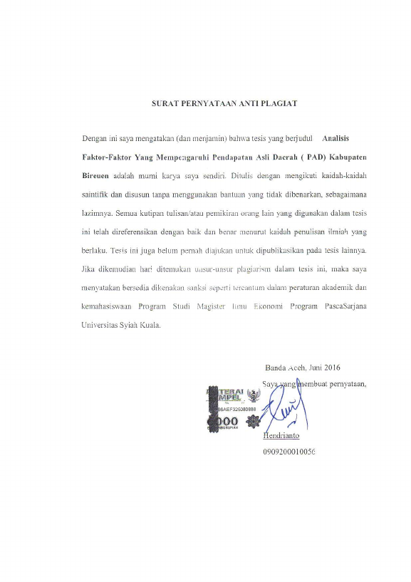 Hendrianto, ANALISIS FAKTOR-FAKTOR YANG MEMPENGARUHI PENDAPATAN ASLI DAERAH (PAD) KABUPATEN BIREUEN. Banda Aceh Program Studi Magister Ilmu Ekonomi Universitas Syiah Kuala,2018