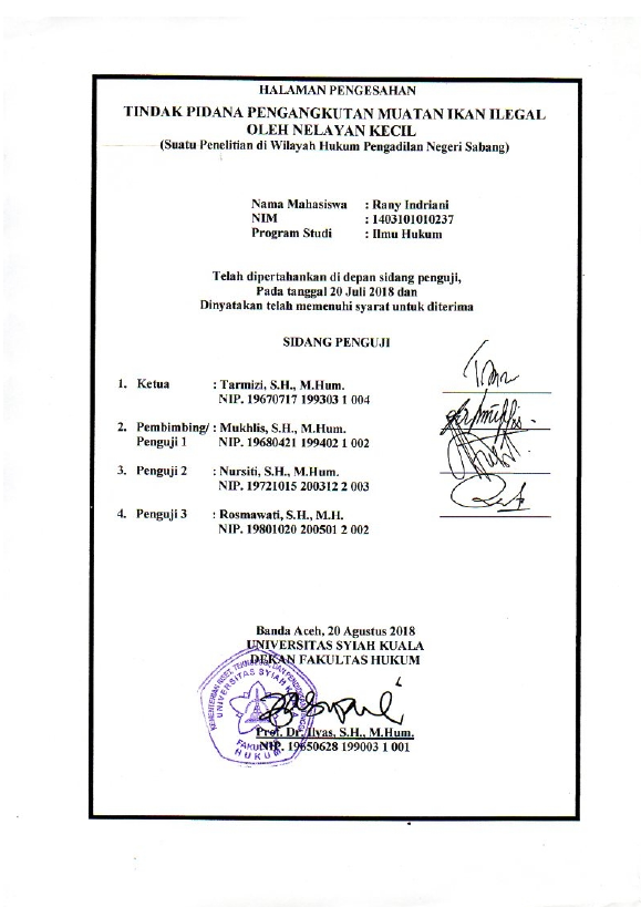 RANY INDRIANI, TINDAK PIDANA PENGANGKUTAN MUATAN IKAN ILEGAL OLEH NELAYAN KECIL (SUATU PENELITIAN DI WILAYAH HUKUM PENGADILAN NEGERI SABANG). Banda Aceh Universitas Syiah Kuala,2018