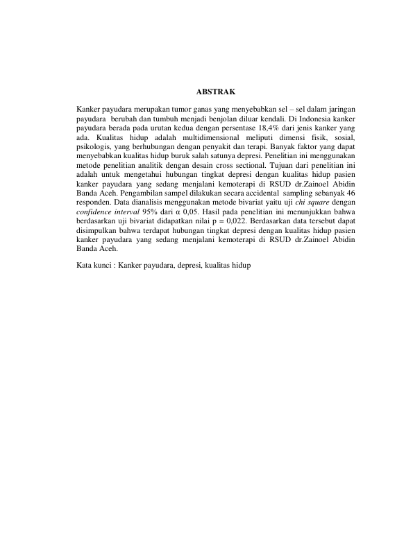 seri mellis yulita, HUBUNGAN TINGKAT DEPRESI DENGAN KUALITAS HIDUP PASIEN KANKER PAYUDARA YANG SEDANG MENJALANI KEMOTERAPI DI RSUD DR.ZAINOEL ABIDIN BANDA ACEH. Banda Aceh Fakultas Kedokteran,2014