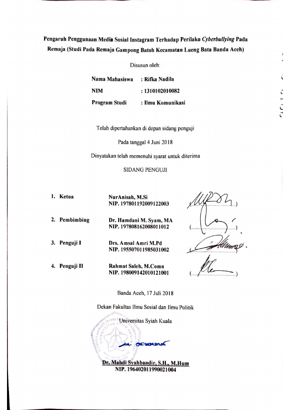 RIFKA NADILA, PENGARUH PENGGUNAAN MEDIA SOSIAL INSTAGRAM TERHADAP PERILAKU CYBERBULLYING PADA REMAJA (STUDI PADA REMAJA GAMPONG BATOH KECAMATAN LUENG BATA BANDA ACEH). Banda Aceh Universitas Syiah Kuala,2018