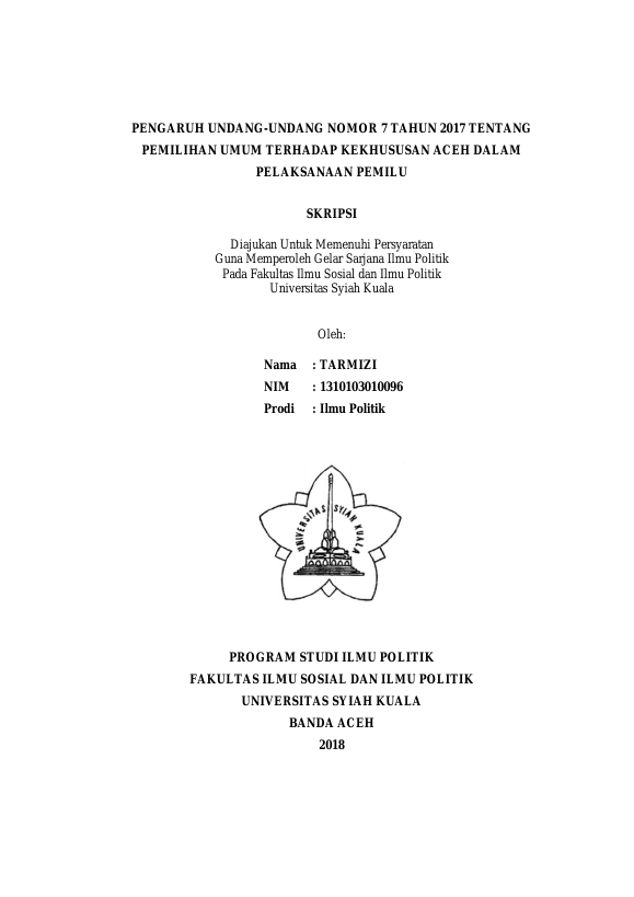 TARMIZI, PENGARUH UNDANG-UNDANG NOMOR 7 TAHUN 2017 TENTANG PEMILIHAN UMUM TERHADAP KEKHUSUSAN ACEH DALAM PELAKSANAAN PEMILU. Banda Aceh Universitas Syiah Kuala,2018
