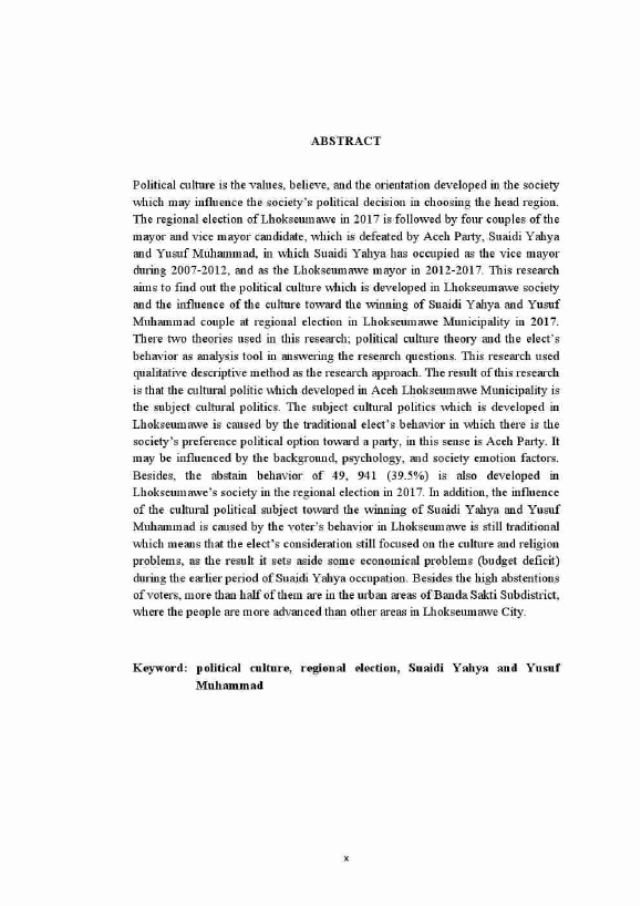SUCI ANNISA ERDA, KEMENANGAN PASANGAN SUAIDI YAHYA DAN YUSUF MUHAMMAD PADA PILKADA KOTA LHOKSEUMAWE TAHUN 2017 (SUATU ANALISIS TERHADAP BUDAYA POLITIK MASYARAKAT KOTA LHOKSEUMAWE). Banda Aceh Universitas Syiah Kuala,2018