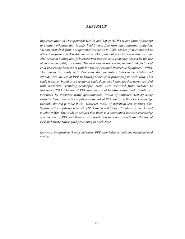 Al Bukhari, HUBUNGAN PENGETAHUAN DAN SIKAP DENGAN PENGGUNAAN ALAT PELINDUNG DIRI PADA PENGOLAH EMAS KRUENG SABEE KABUPATEN ACEH JAYA. Banda Aceh Fakultas Kedokteran,2014