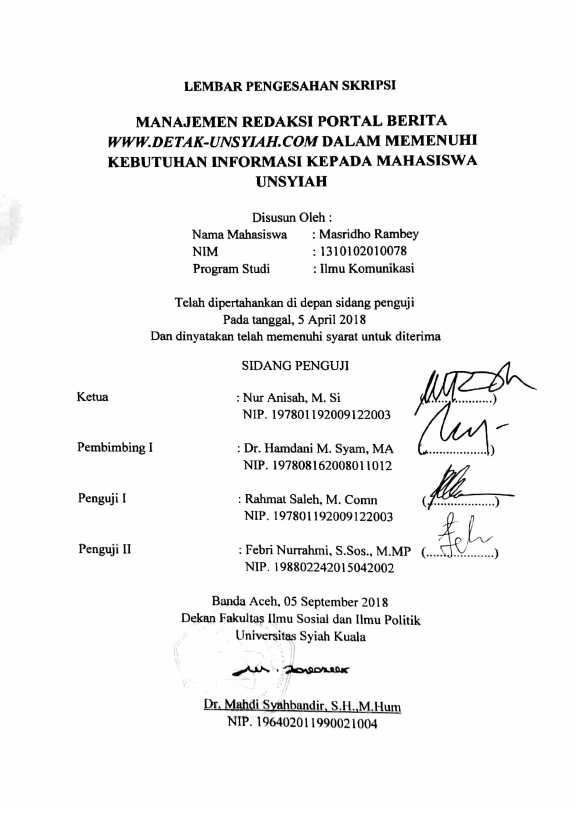 MASRIDHO RAMBEY, MANAJEMEN REDAKSI PORTAL BERITA WWW.DETAK-UNSYIAH.COM DALAM MEMENUHI KEBUTUHAN INFORMASI KEPADA MAHASISWA UNSYIAH. Banda Aceh Universitas Syiah Kuala,2018