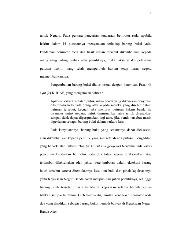 Nurul Maghfirah, EKSEKUSI PUTUSAN BARANG BUKTI PENCURIAN KENDARAAN BERMOTOR RODA DUA (SUATU PENELITIAN DI WILAYAH HUKUM KEJAKSAAN NEGERI BANDA ACEH). Banda Aceh Universitas Syiah Kuala,2018