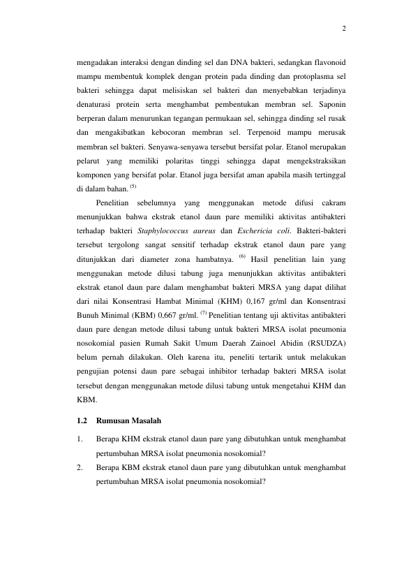 M. Rizky Fachri, UJI AKTIVITAS ANTIBAKTERI EKSTRAK ETANOL DAUN PARE (MOMORDICA CHARANTIA) TERHADAP METHICILLIN RESISTANT STAPHYLOCOCCUS AUREUS ISOLAT PNEUMONIA PASIEN RSUDZA SECARA DILUSI. Banda Aceh Fakultas Kedokteran,2014