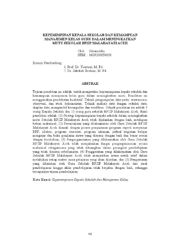 SABARUDDIN, KEPEMIMPINAN KEPALA SEKOLAH DAN KEMAMPUAN MANAJEMEN KELAS GURU DALAM MENINGKATKAN MUTU SEKOLAH BP2IP MALAHAYATI ACEH. Banda Aceh Program Studi Magister Administrasi Pendidikan Universitas Syiah Kuala,2018