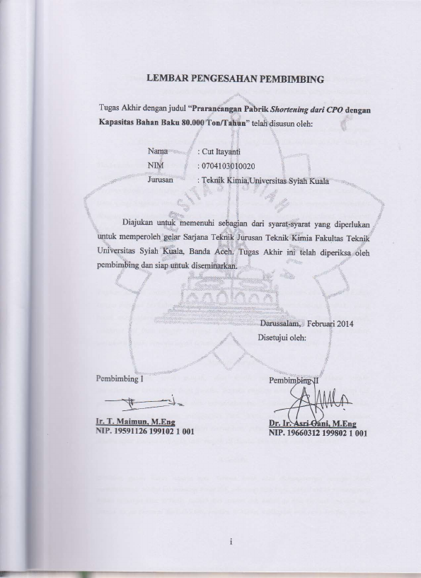 Baca Juga : PRA-RANCANGAN PABRIK SHORTENING DARI CPO DENGAN KAPASITAS BAHAN BAKU 80.000 TON/TAHUN (Cut Itayanti, 2014)