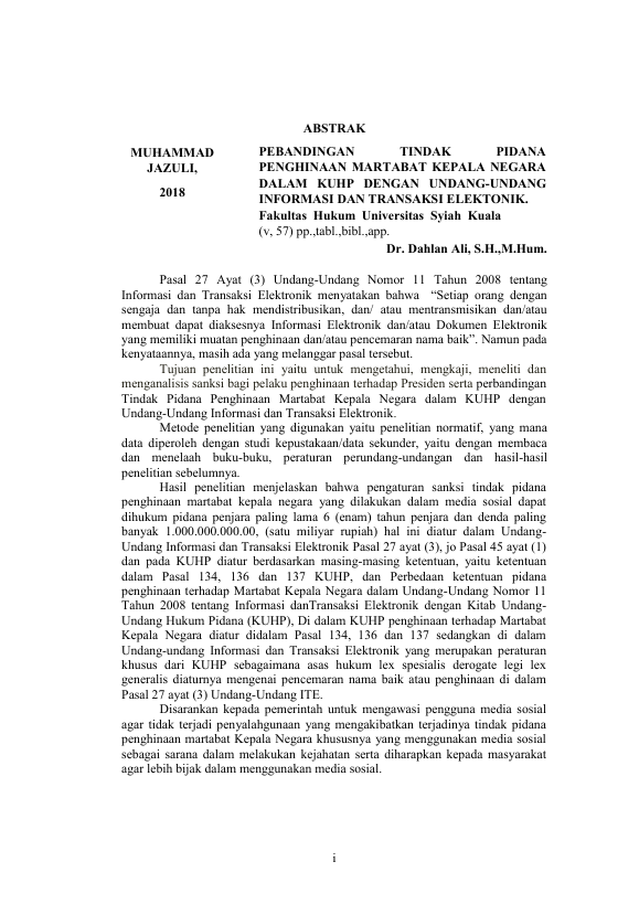 Muhammad Jazuli, PERBANDINGAN TINDAK PIDANA PENGHINAAN MARTABAT KEPALA NEGARA DALAM KUHP DENGAN UNDANG-UNDANG INFORMASI DAN TRANSAKSI ELEKTRONIK. Banda Aceh Universitas Syiah Kuala,2018