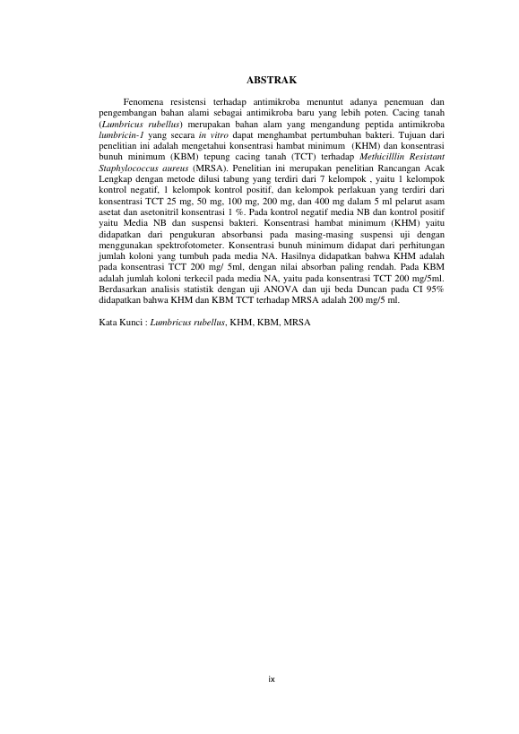 Mauliza, PENENTUAN KONSENTRASI HAMBAT MINIMUM DAN KONSENTRASI BUNUH MINIMUM TEPUNG CACING TANAH (LUMBRICUS RUBELLUS) TERHADAP METHICILLIN RESISTANT STAPHYLOCOCCUS AUREUS. Banda Aceh Universitas Syiah Kuala,2014