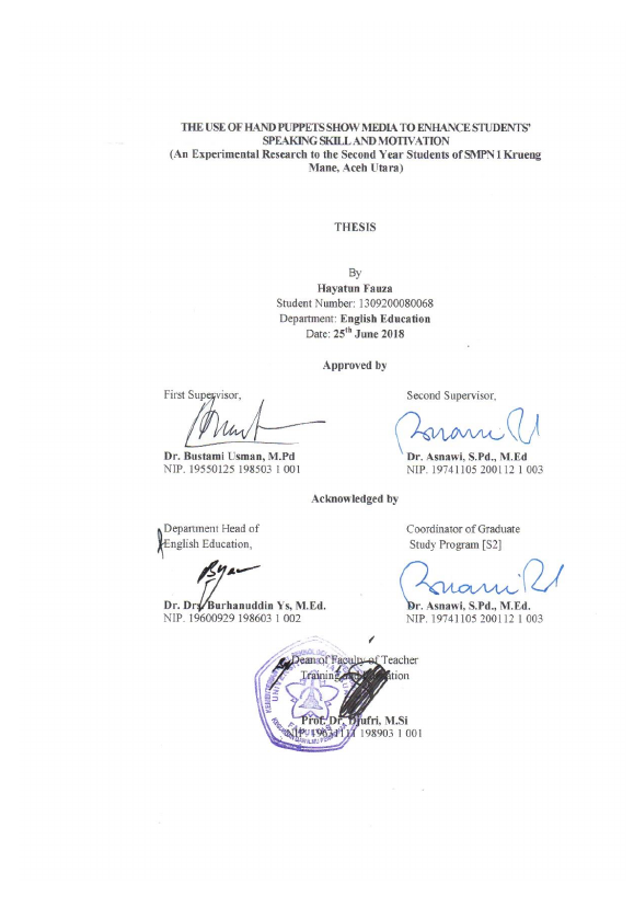 Hayatun Fauzan, THE USE OF HAND PUPPETS SHOW MEDIA TO ENHANCE STUDENTS’ SPEAKING SKILL AND MOTIVATION (AN EXPERIMENTAL RESEARCH TO THE SECOND YEAR STUDENTS OF SMPN 1 KRUENG MANE, ACEH UTARA). Banda Aceh Graduate Program In English Language Education, Syiah Kuala University,2018