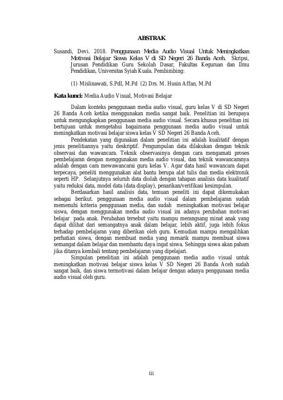 Devi Susandi, PENGGUNAAN MEDIA AUDIO VISUAL UNTUK MENINGKATKAN MOTIVASI BELAJAR SISWA KELAS V DI SD NEGERI 26 BANDA ACEH. Banda Aceh FAKULTAS KEGURUAN DAN ILMU PENDIDIKAN UNIVERSITAS SYIAH KUALA,2018