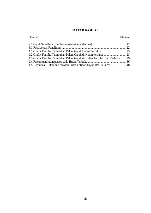 NURUL A`LA, TINGKAT KESAMAAN JENIS PAKAN GAJAH SUMATERA (ELEPHAS MAXIMUS SUMATRANUS) PADA HUTAN TERBUKA (OPEN FOREST) DAN HUTAN TERTUTUP (CLOSED FOREST) DI PUSAT LATIHAN GAJAH (PLG) SAREE, KABUPATEN ACEH BESAR TINGKAT KESAMAAN JENIS PAKAN GAJAH SUMATERA (ELEPHAS MAXIMUS SUMATRANUS) PADA HUTAN TERBUKA (OPEN FOREST) DAN HUTAN TERTUTUP (CLOSED FOREST) DI PUSAT LATIHAN GAJAH (PLG) SAREE, KABUPATEN ACEH BESAR. Banda Aceh Universitas Syiah Kuala,2018