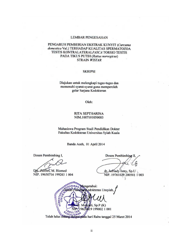 Baca Juga : PENGARUH PEMBERIAN EKSTRAK KUNYITRN(CURCUMA DOMESTICA VAL.) TERHADAP KUALITASRNSPERMATOZOA TESTIS IPSILATERALRNPASCA DETORSI PADA TIKUSRNPUTIH (RATTUS NORVEGICUS)RNYANG MENGALAMIRNTORSIO (Dita Vebiola, 2014)