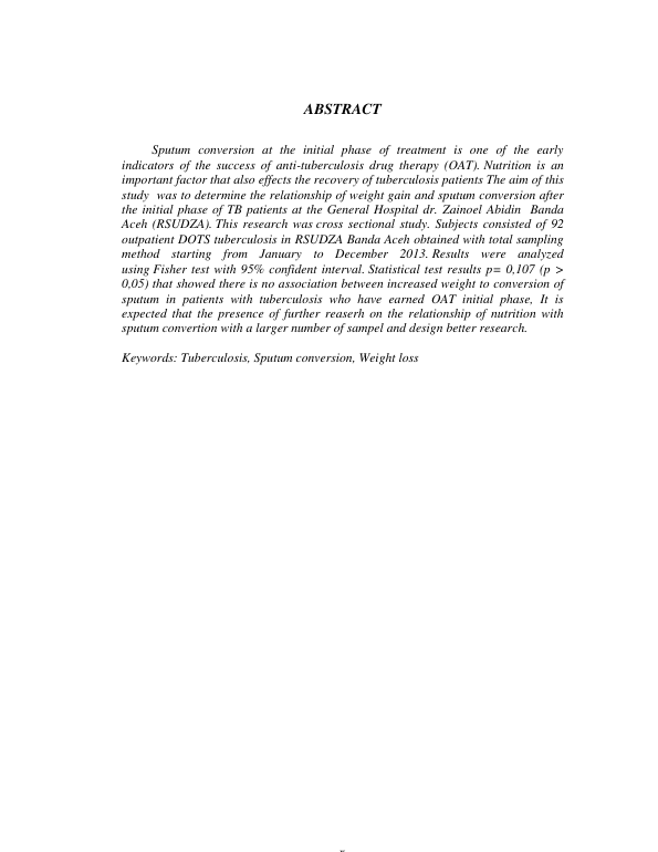 Yaum Aamruna, HUBUNGAN PENINGKATAN BERAT BADAN FE4NGAN KONVERSI SPUTUM PADA PASIEN TUBERKULOSIS DI RSUDZA BANDA ACEH. Banda Aceh Universitas Syiah Kuala,2014