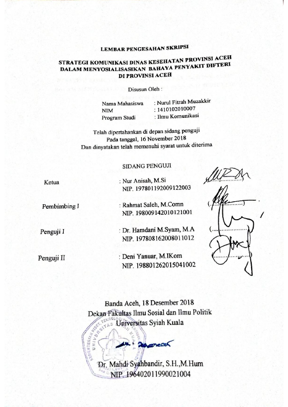 Nurul Fitrah Muzakkir, STRATEGI KOMUNIKASI DINAS KESEHATAN PROVINSI ACEH DALAM MENYOSIALISASIKAN BAHAYA PENYAKIT DIFTERI DI PROVINSI ACEH. Banda Aceh Universitas Syiah Kuala,2018