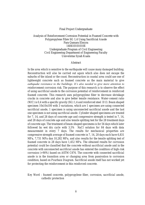 Baca Juga : ANALISIS POTENSIAL KOROSI TULANGAN PADA BETON BUSA BERSERAT POLYPROPYLENE SG 1,4 DENGAN PENGGUNAAN ANODA KORBAN (FARA QAMARA ELMYRA, 2018)
