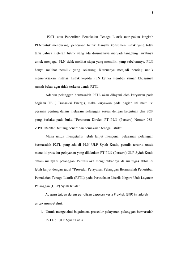 TEUKU INDRA SETIAWAN, PROSEDUR PELAYANAN PELANGGAN BERMASALAH PENERTIBAN PEMAKAIAN TENAGA LISTRIK (P2TL) PADA PT.PLN (PERSERO) UNIT LAYANAN PELANGGAN (ULP ) SYIAH KUALA BANDA ACEH. Banda Aceh Universitas Syiah Kuala,2019