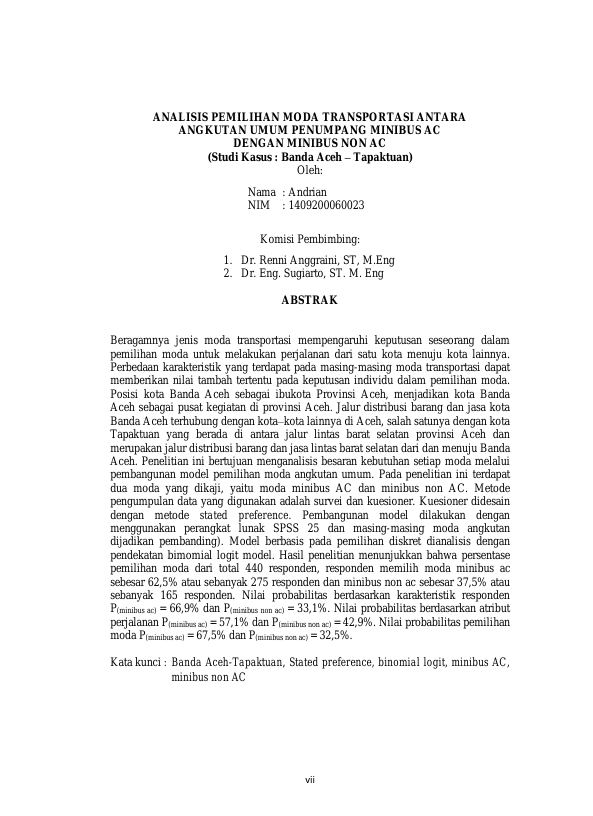 ANDRIAN, ANALISIS PEMILIHAN MODA TRANSPORTASI ANTARA ANGKUTAN UMUM PENUMPANG MINIBUS AC DENGAN MINIBUS NON AC (STUDI KASUS : BANDA ACEH – TAPAKTUAN). Banda Aceh Program Studi Magister Teknik Sipil Universitas Syiah Kuala,2018