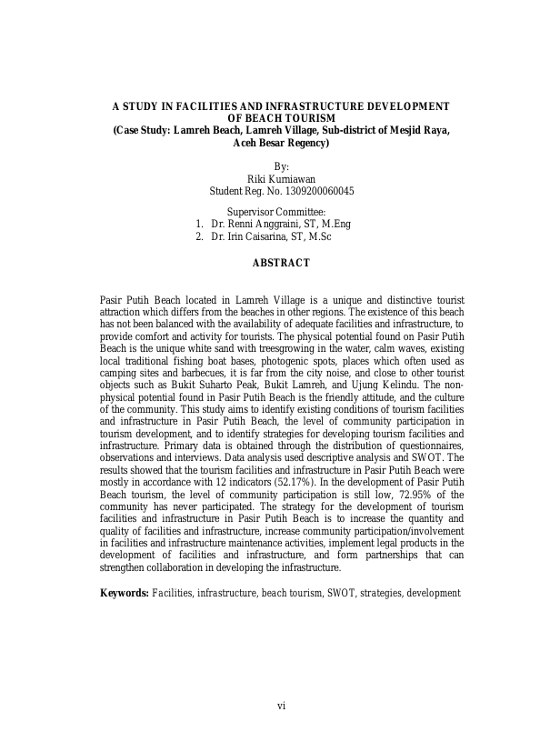 Riki Kurniawan, KAJIAN PENGEMBANGAN SARANA DAN PRASARANA PARIWISATA PANTAI (STUDI KASUS: PANTAI PASIR PUTIH DESA LAMREH KECAMATAN MESJID RAYA KABUPATEN ACEH BESAR). Banda Aceh Program Studi Magister Teknik Sipil Universitas Syiah Kuala,2018