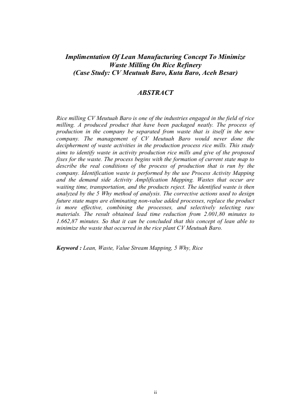 Rahmat Arfaz, PENERAPAN KONSEP LEAN MANUFACTURING UNTUK MEMINIMASI PEMBOROSAN PENGGILINGAN PADA KILANG PADI (STUDI KASUS : CV MEUTUAH BARO). Banda Aceh Universitas Syiah Kuala,2019