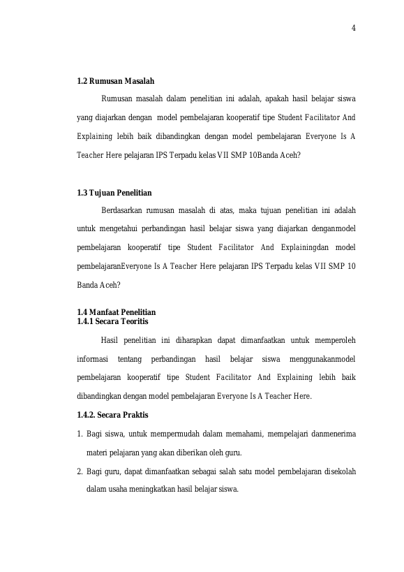 Mega Novita Sari, PERBANDINGAN HASIL BELAJAR SISWA MENGGUNAKAN MODEL PEMBELAJARAN STUDENT FACILITATOR AND EXPLAINING DENGAN MODEL PEMBELAJARAN EVERYONE IS A TEACHER HERE PELAJARAN IPS TERPADU KELAS VII SMP NEGERI 10 BANDA ACEH. Banda Aceh Universitas Syiah Kuala,2019
