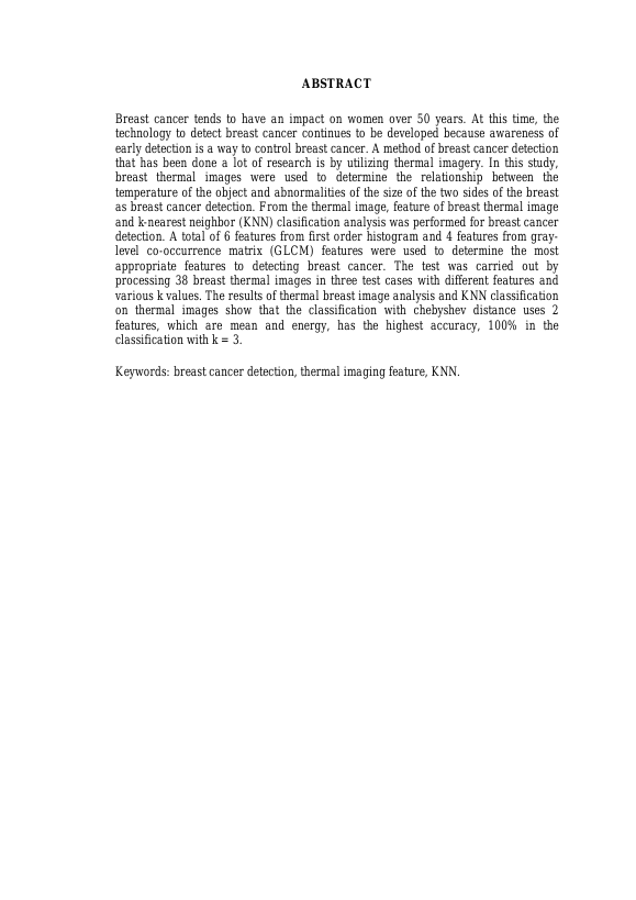 Mentari Bella Al Rasyid, DETEKSI KANKER PAYUDARA BERBASIS FITUR CITRA TERMAL DAN KLASIFIKASI K-NEAREST NEIGHBOR (KNN). Banda Aceh Program Studi Magister Teknik Elektro Universitas Syiah Kuala,2018