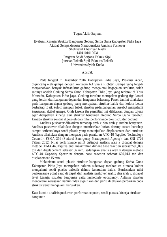 Shofiyatul Khairiyah Nasty, EVALUASI KINERJA STRUKTUR BANGUNAN GEDUNG SERBA GUNA KABUPATEN PIDIE JAYA AKIBAT GEMPA DENGAN MENGGUNAKAN ANALISIS PUSHOVER. Banda Aceh Universitas Syiah Kuala,2019
