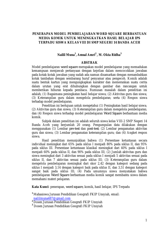 Nailil Muna, PENERAPAN MODEL PEMBELAJARAN WORD SQUARE BERBANTUAN MEDIA KOMIK UNTUK MENINGKATKAN HASIL BELAJAR IPS TERPADU SISWA KELAS VIII SMP NEGERI 14 BANDA ACEH. Banda Aceh Universitas Syiah Kuala,2019