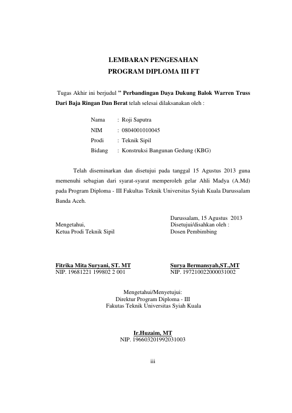 roji saputra, PERBANDINGAN DAYA DUKUNG BALOK WARREN TRUSS DARI BAJA RINGAN DAN BAJA BERAT. Banda Aceh Fakultas Teknik,2013