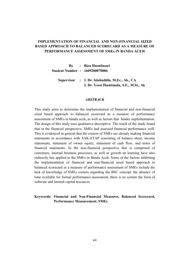 RIZA HUSNILASARI, PENERAPAN UKURAN KEUANGAN DAN NON KEUANGAN BERDASARKAN PENDEKATAN BALANCED SCORECARD SEBAGAI UKURAN PENILAIAN KINERJA PADA UMKM DI KOTA BANDA ACEH. Banda Aceh Program Studi Magister Akuntansi Universitas Syiah Kuala,2019