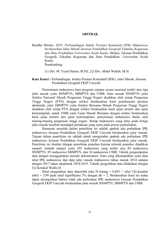 PERBANDINGAN INDEKS PRESTASI KUMULATIF (IPK) MAHASISWA BERDASARKAN JALUR MASUK JURUSAN PENDIDIKAN GEOGRAFI FAKULTAS KEGURUAN DAN ILMU PENDIDIKAN UNIVERSITAS SYIAH KUALA PERBANDINGAN INDEKS PRESTASI KUMULATIF (IPK) MAHASISWA BERDASARKAN JALUR MASUK JURUSAN PENDIDIKAN GEOGRAFI FAKULTAS KEGURUAN DAN ILMU PENDIDIKAN UNIVERSITAS SYIAH KUALA. Banda Aceh Universitas Syiah Kuala,2019