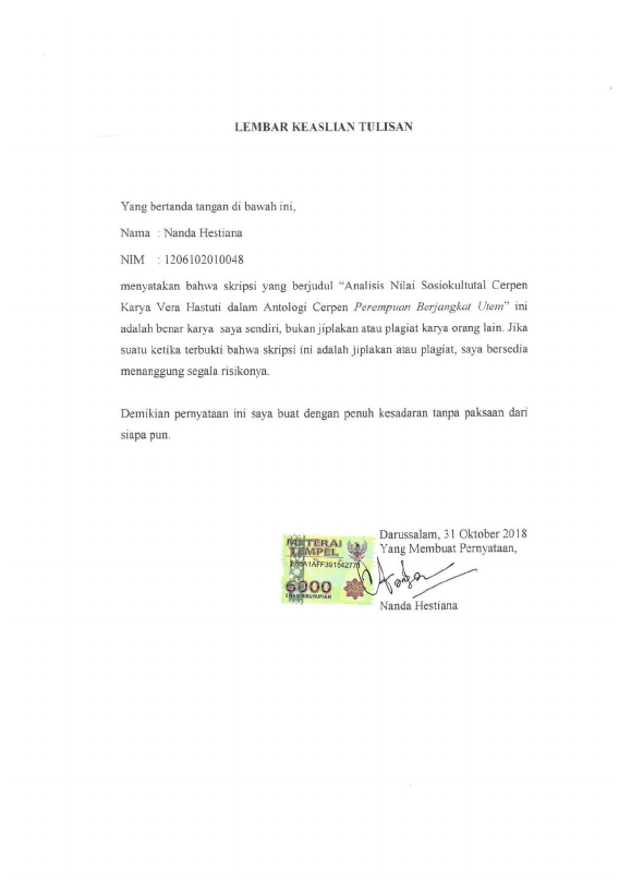 Nanda Hestiana, ANALISIS NILAI SOSIOKULTURAL CERPEN KARYA VERA HASTUTI DALAM ANTOLOGI CERPEN PEREMPUANBERJANGKAT UTEM. Banda Aceh Universitas Syiah Kuala,2019