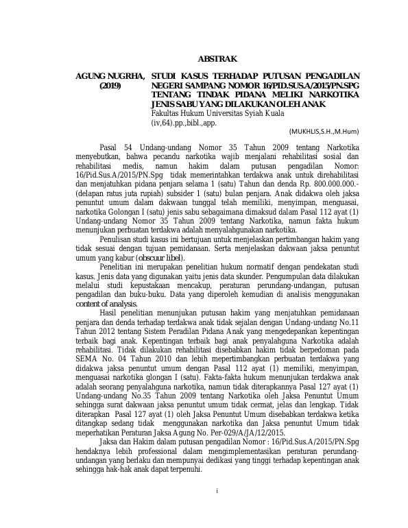 AGUNG NUGRAHA, STUDI KASUS TERHADAP PUTUSAN PENGADILAN NEGERI SAMPANG NOMOR 16/PID.SU.A/2015/PN.SPG TENTANG TINDAK PIDANA MEMILIKI NARKOTIKA JENIS SABU YANG DI LAKUKAN OLEH ANAK. Banda Aceh Universitas Syiah Kuala,2019