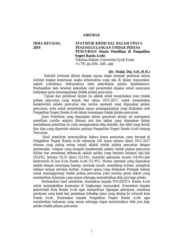 IRMA DEVIANA, STATISTIK KRIMINAL DALAM UPAYA PENANGGULANGAN TINDAK PIDANA PENCURIAN (SUATU PENELITIAN DI PENGADILAN NEGERI BANDA ACEH) STATISTIK KRIMINAL DALAM UPAYA PENANGGULANGAN TINDAK PIDANA PENCURIAN (SUATU PENELITIAN DI PENGADILAN NEGERI BANDA ACEH) STATISTIK KRIMINAL DALAM UPAYA PENANGGULANGAN TINDAK PIDANA PENCURIAN (SUATU PENELITIAN DI PENGADILAN NEGERI BANDA ACEH). Banda Aceh Universitas Syiah Kuala,2019