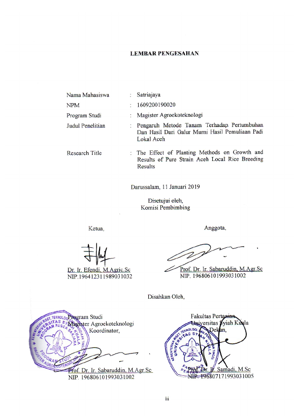 SATRIA JAYA, PENGARUH METODE TANAM TERHADAP PERTUMBUHAN DAN HASIL DARI GALUR MURNI HASIL PEMULIAAN PADI LOKAL ACEH. Banda Aceh Program Studi Magister Agroekoteknologi Universitas Syiah Kuala,2019