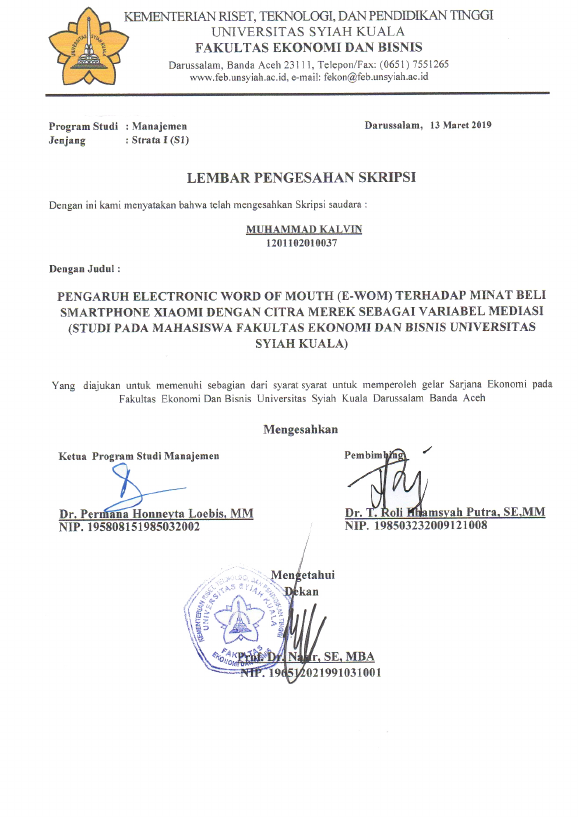 Muhammad Kalvin, PENGARUH ELECTRONIC WORD OF MOUTH (E-WOM) TERHADAP MINAT BELI SMARTPHONE XIOAMI DENGAN CITRA MEREK SEBAGAI VARIABEL MEDIASI (STUDI PADA MAHASISWA FAKULTAS EKONOMI DAN BISNIS UNIVERSITAS SYIAH KUALA). Banda Aceh FAKULTAS EKONOMI BISNIS UNIVERSITAS SYIAH KUALA,2018